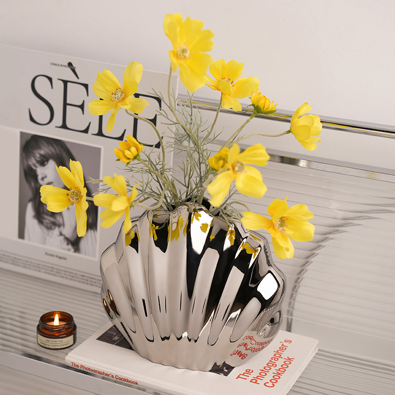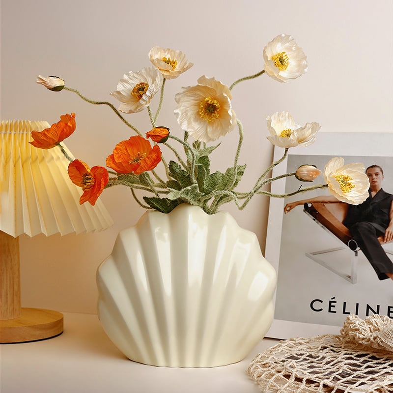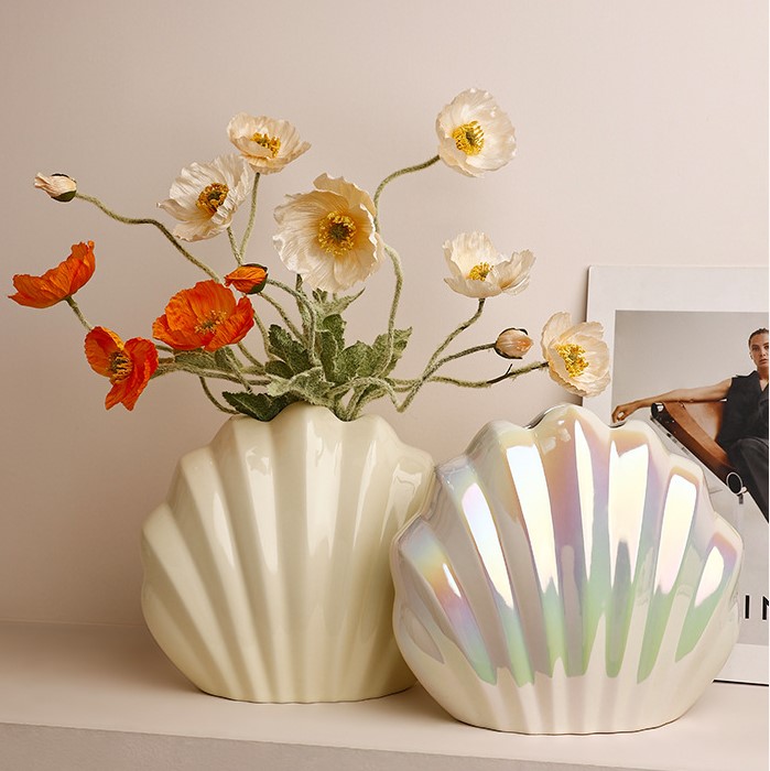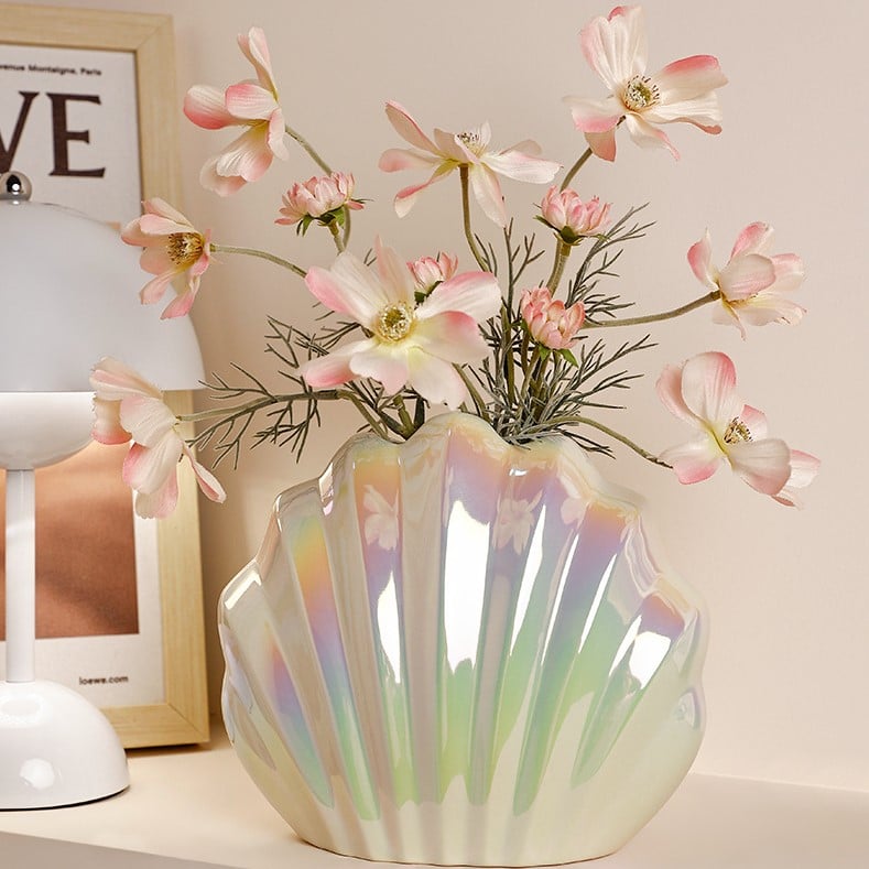 This Seashell Porcelain Vase is a decorative piece of home decor that is made of porcelain and shaped like a seashell. It is typically white in color and has a smooth, glossy finish. The vase has a flared opening at the top, which allows for the placement of flowers or other decorative items.
