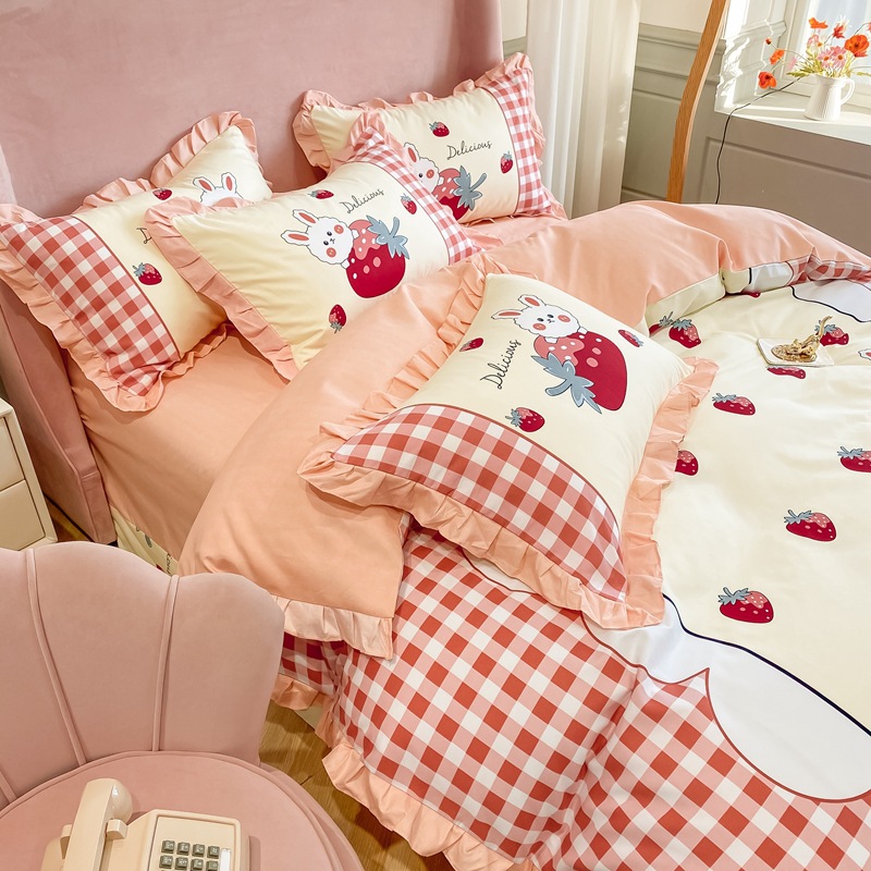 4pcs Sweet Strawberry Grid Pattern Bedding Set