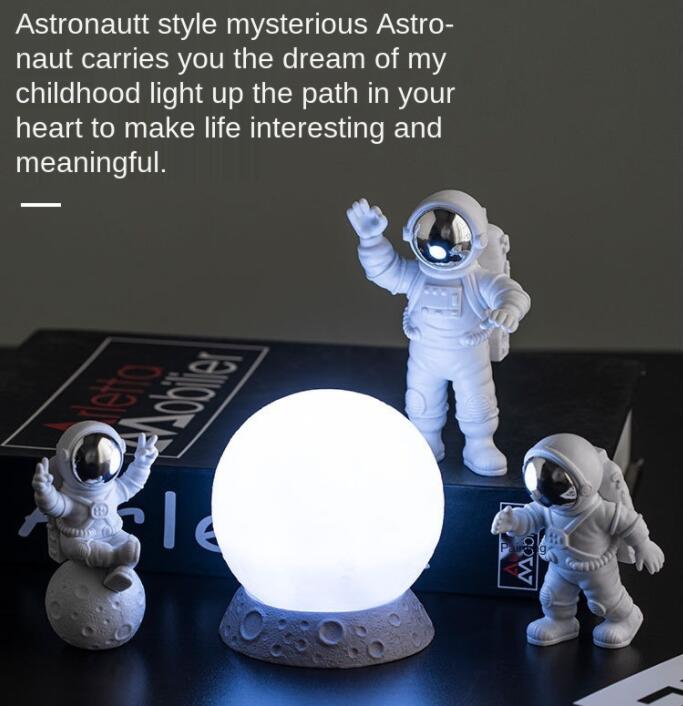 Color:Gold, Silver Material:Resin+PVC Power supply mode: Battery Charging Package: 3pcs Astronaut Figures + 1pc Moon Lamp