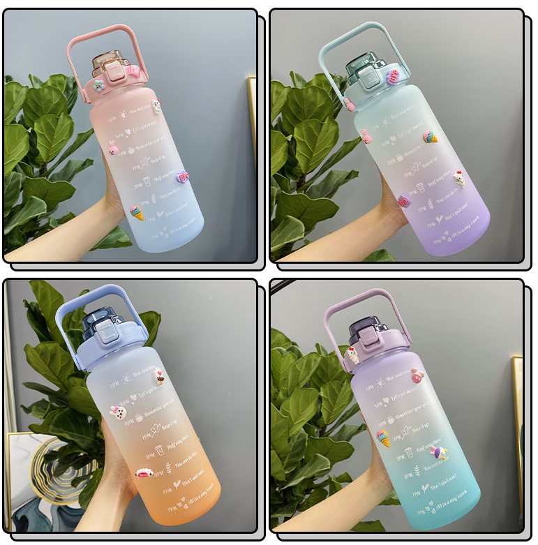 2L Large Capacity Water Bottle Straw Cup Gradient Color Plastic Water Cups With Time Marker Outdoor Fitness Sports Bottle