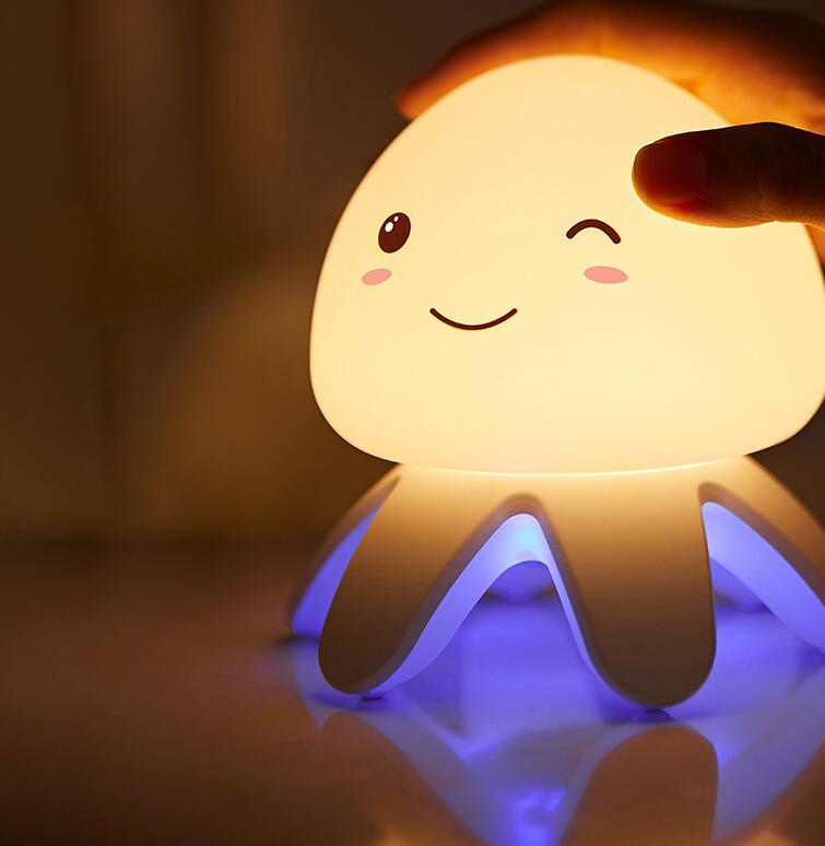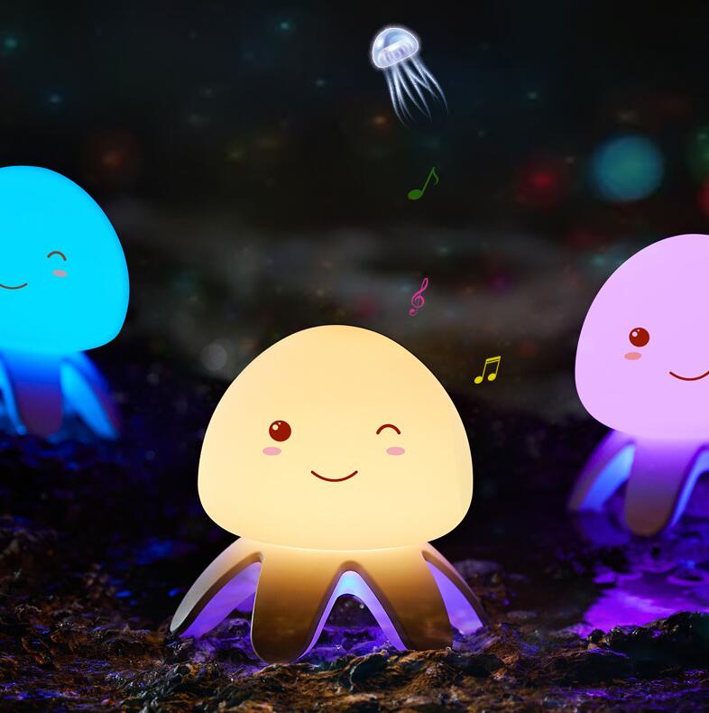 A Jellyfish Music Light Table Lamp is a decorative and functional lighting piece that is shaped like a jellyfish. It is made of soft Silica gel material that allows light to pass through and creates a beautiful, ethereal effect. The lamp has a built-in speaker that plays music or ambient sounds, adding a soothing and relaxing atmosphere to a room. The lamp has a base that sits on a table or desk, and the jellyfish-shaped lampshade can be adjusted to different angles to direct the light and create different lighting effects. The Jellyfish Music Light Table Lamp is a unique and eye-catching addition to a bedroom, living room, or office. It is a perfect choice for those who love jellyfish-themed decor or who appreciate functional and decorative lighting pieces.