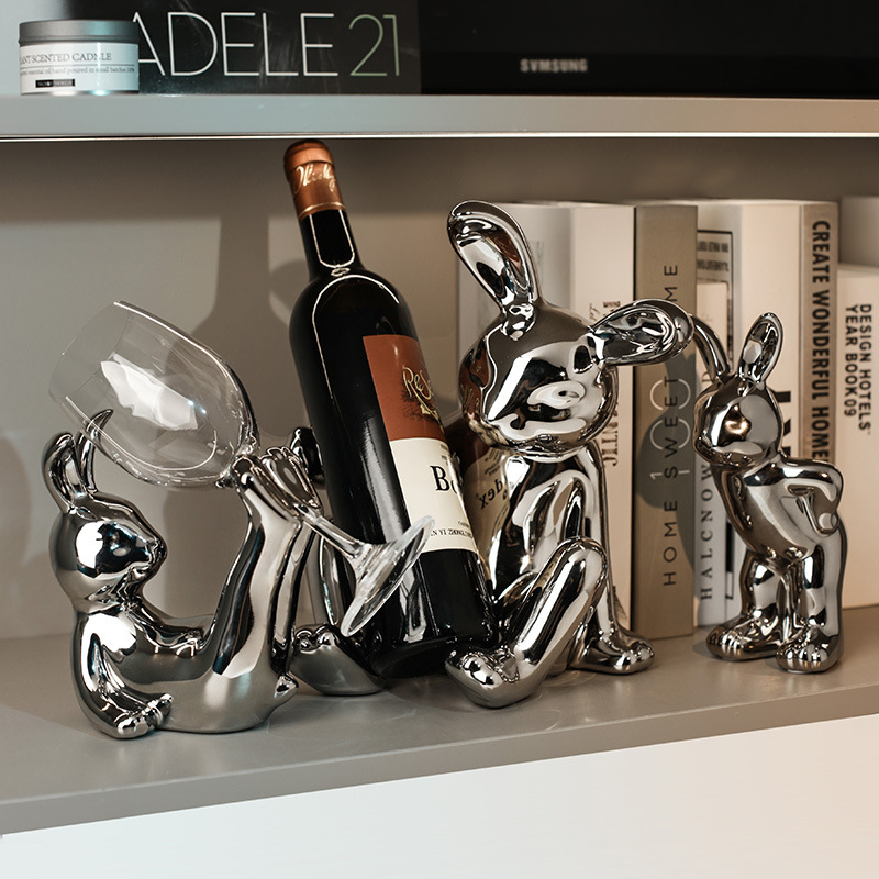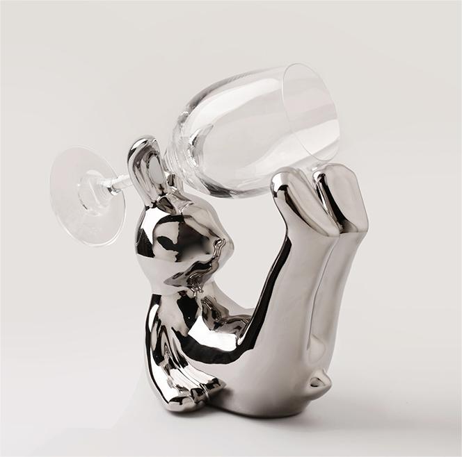 This Silver Rabbit Wine Rack is a wine storage accessory designed in the shape of a rabbit. It is made of silver-plating ceramics and is used to hold wine bottles. The rabbit's body is designed to hold the neck of the wine bottle and the base provides stability for the bottle to stand upright. This wine rack adds a decorative touch to any kitchen or bar area and is a unique way to display wine.